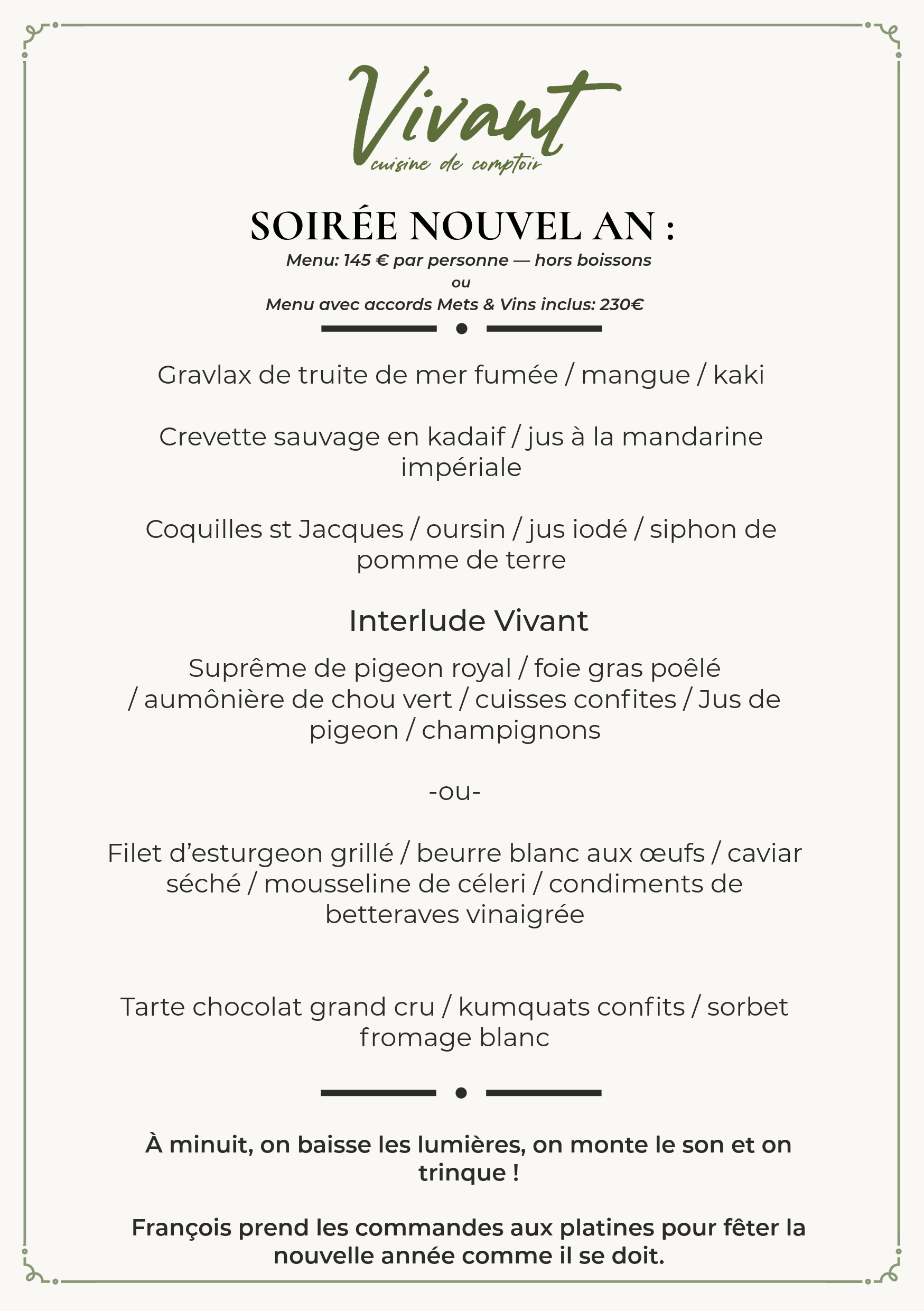 Réveillon du Nouvel An Dîner d’Exception & Soirée dansante ! Menu gastronomique en plusieurs services, décoration festive & ambiance conviviale À minuit, on pop le champagne, on compte ensemble, et… la soirée s'embrase avec notre DJ François aux platines jusqu’au bout de la nuit Danse, fête, bonne humeur — tout est réuni pour accueillir la nouvelle année de la plus belle des façons. VIVANT !